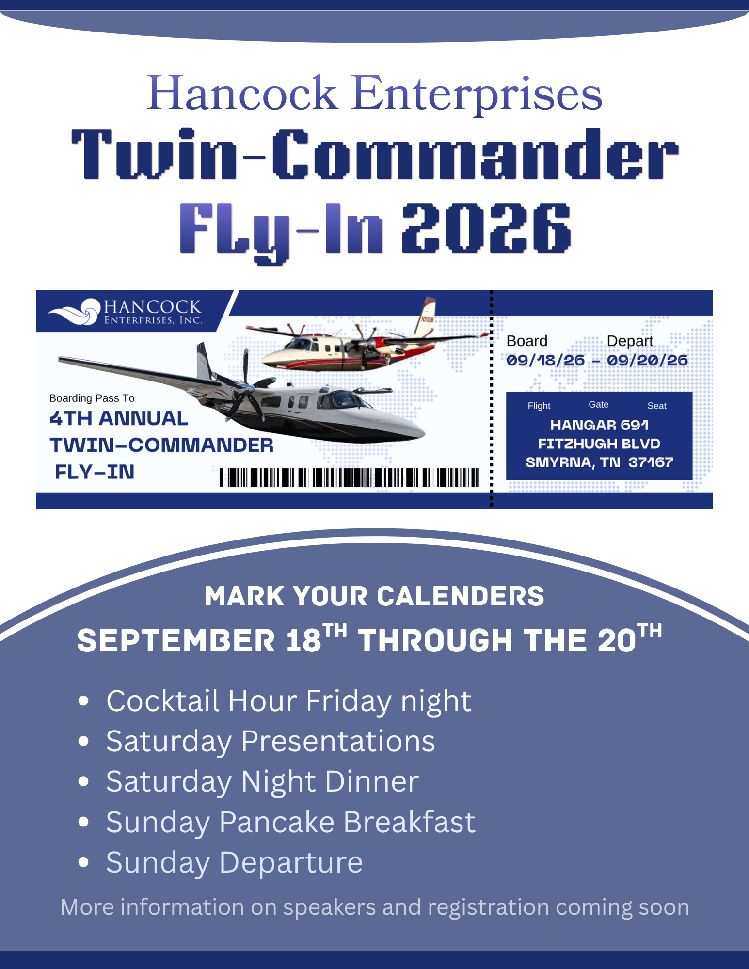Mark your calendars! We are happy to announce our 2026 Twin Commander Fly in on September 18-20! We look forward too seeing everyone! Save the Date! Come join us for our 4th annual Twin Commander Fly In at our facility in Smyrna, TN at MQY. We have a great line up of and speakers again this year! We will have registration up soon as well as a special hotel rate again as well. Please feel free to contact us with an questions. We hope to see everyone there!